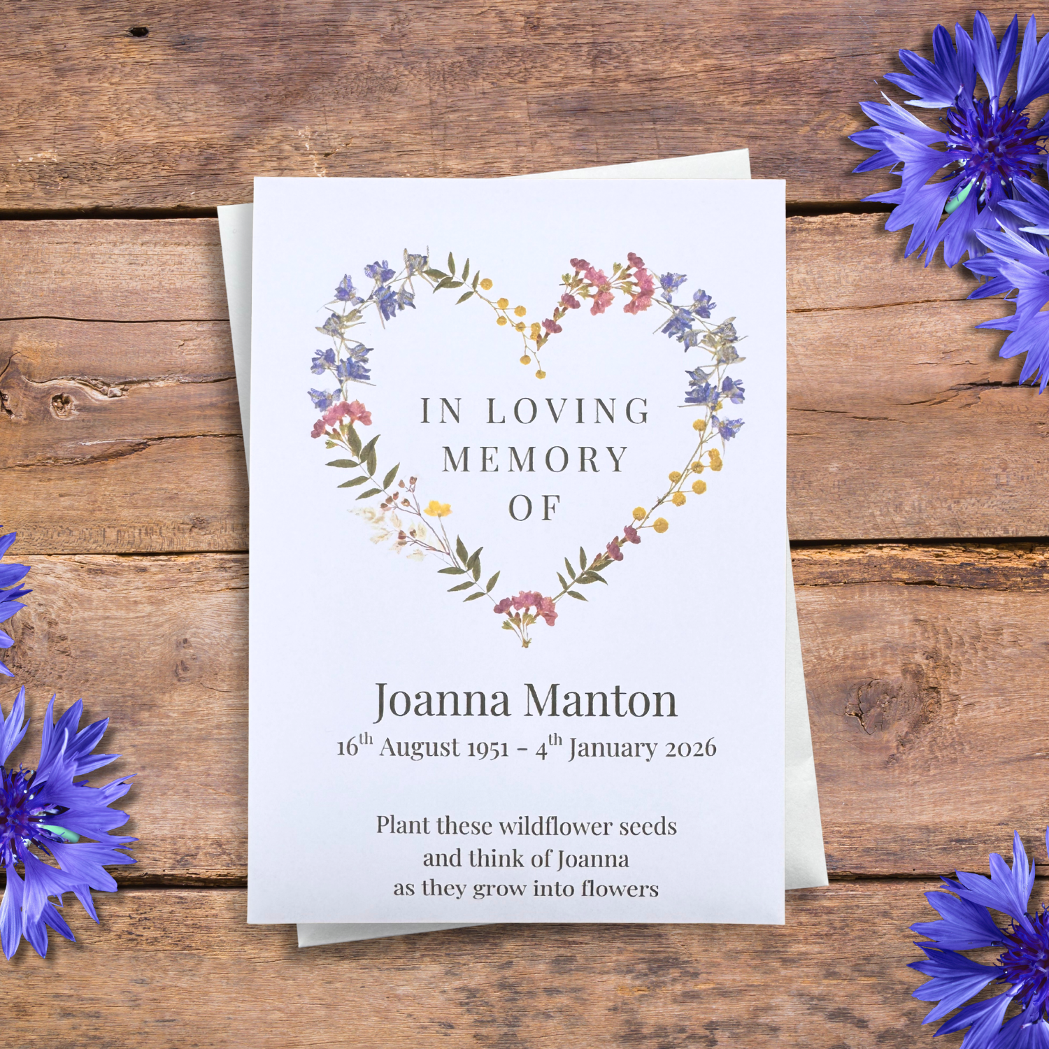 These beautiful personalised wildflower seed favours provide a thoughtful way to remember a loved who has passed through growing flowers. Ideal for giving away at funerals alongside order of services.